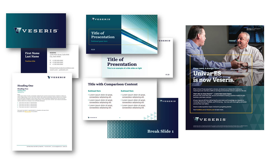 Brand materials were developed to continue the new brand story using elements and designs established through the guidelines. This included business cards, deck templates, letterhead, and brand launch advertising.